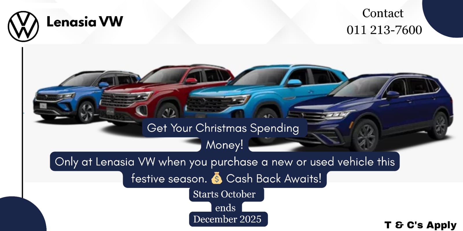Get Your Christmas Spending Money! Only at Lenasia VW when you purchase a new or used vehicle this festive season.